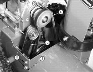 The first step is to check the condition of the belts. There is a plastic housing that covers the pulleys and belts. It is located between the engine and the chute of the snowblower. Remove two bolts that hold it in place and then remove the plastic housing.